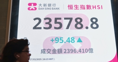 香港中通社3月27日電(記者 譚暢)港股27日回升,恆生指數當日升95點或0.4%,報24951點;本周累跌325點或1.3%,已連跌四周。大市全日成交額約為2630.81億港元。