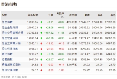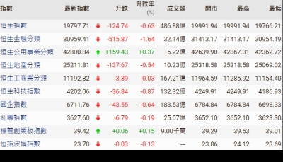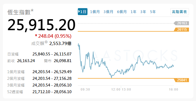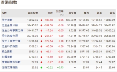香港新聞網4月23日電 港股23日收跌248點或0.95%,報25915點。國企指數跌69點或0.79%,報8732點;恆生科技指數跌98點或1.98%,報4865點。