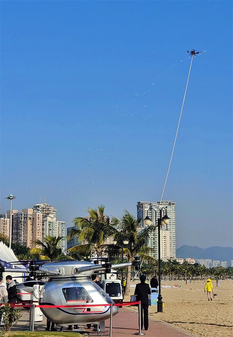 無人機海上救援演練。(陸紹龍攝) “無人戰法”首秀開啟無人裝備多場景應用 本屆大會期間將特別舉行“陸海空”全場景應用創新動態演練,首秀“無人戰法”,大規模運用無人機、無人船艇、無人車、履帶機械人等技術產品,聯合應急、消防、邊防、公安、海事等部門及無人系統領域企業,充分展示無人系統技術創新、應用創新、成果轉化以及立體化作戰能力。