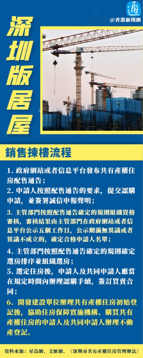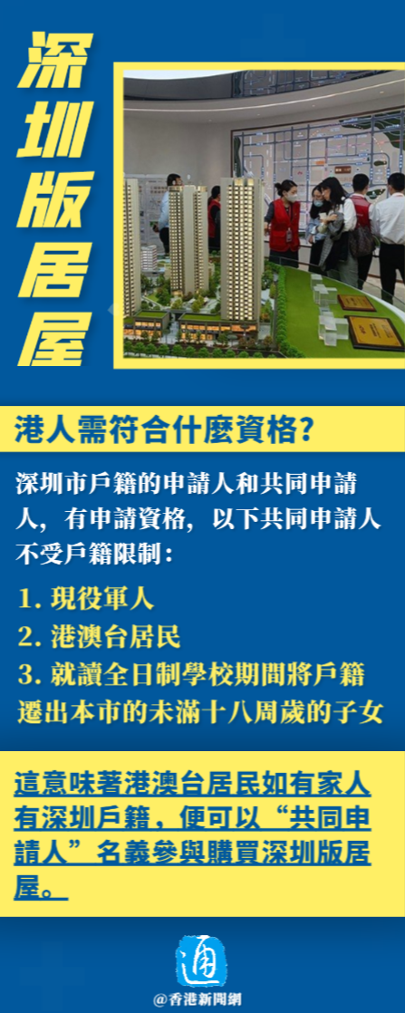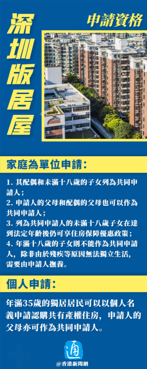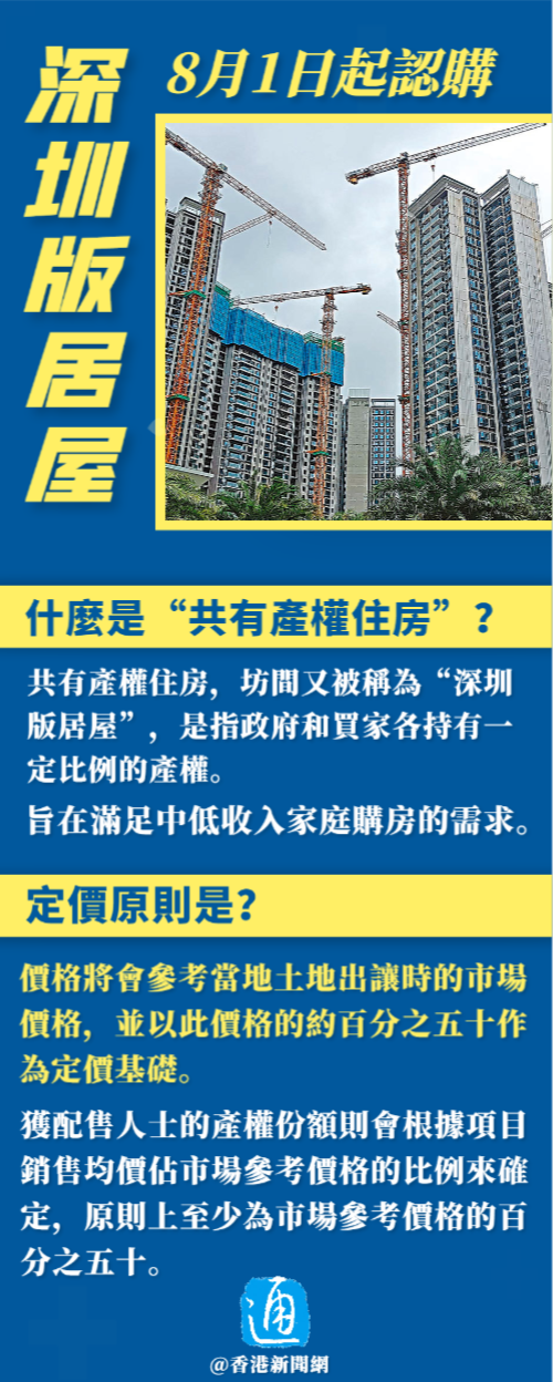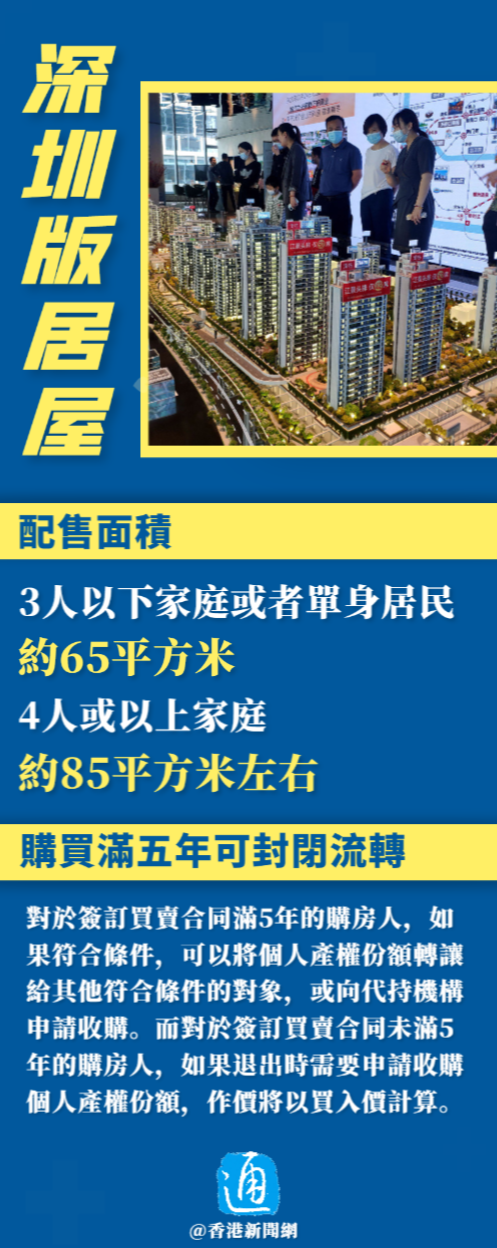 香港新聞網7月31日電 深圳市政府近日推出內地版居屋“共有產權住房”,根據《深圳市共有產權住房管理辦法》,自8月1日起港澳台居民可作為深圳戶籍家人的共同申請人參與申請認購共有產權住房。這項政策讓港澳台居民能夠享受到深圳市共有產權住房的優惠,並不受戶籍限制。 值得注意的是,香港2023居屋今日(7月31日)亦開放申請,不過,深圳“居屋”比香港的大了差不多一倍,有聲音認為深圳“共有產權住房”會吸引香港購買力去支持深圳樓市。 什麼是“共有產權住房”?售價多少?面積多大?申請人需滿足什麼要求?申請流程是什麼?深圳“共有產權住房”VS香港居屋,你覺得哪個更有吸引力?