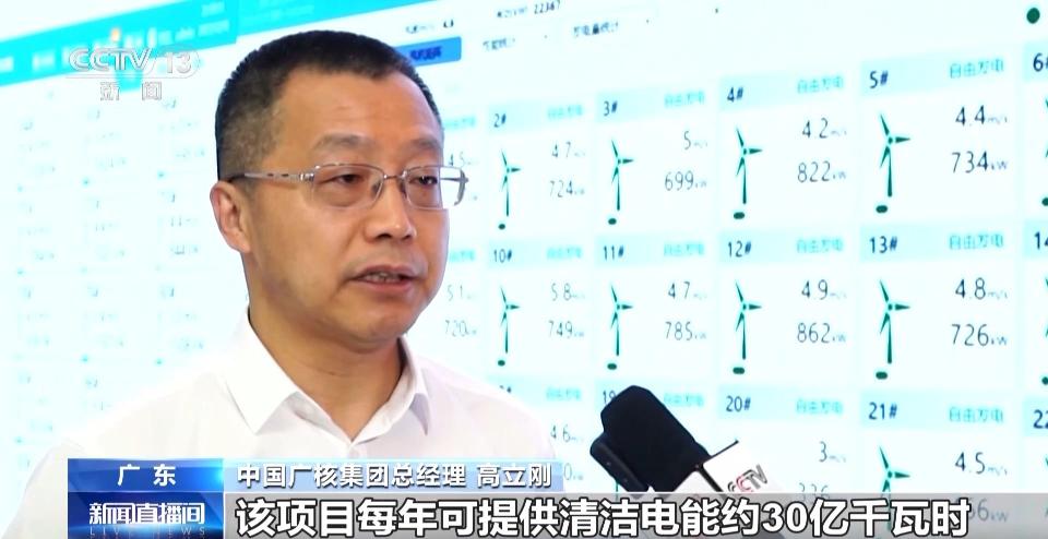 央視新聞截圖(下同) 中國廣核集團總經理 高立剛:該項目每年可提供清潔電能約30億千瓦時,等效節省標準煤約100萬噸,惠州港口100萬千瓦海上風電廠的成功投產,將為粵港澳大灣區經濟社會發展以及國家雙碳戰略提供清潔能源助力。