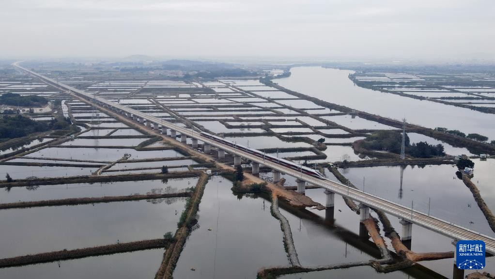 12月26日,汕汕高鐵首趟列車駛過鰲江特大橋(無人機照片)。來源:新華社