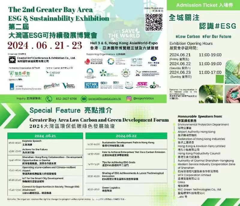 展覽更特設“ESG實踐企業大獎”頒獎禮,表揚為可持續發展作出貢獻的企業,同時鼓勵更多企業共同促進ESG發展。除了展覽、論壇活動、頒獎禮外,展覽會亦設立初創園區,展示年輕人的創新思維,為初創企業提供難得的展示平台與機會。 展覽同期重點活動,6月21日及22日將舉行“2024大灣區環保低碳綠色發展論壇”,屆時環境保護署、前海深港現代服務業合作區管理局、香港機場管理局、香港生產力促進局、香港工業總會、離島婦聯、香港鐵路有限公司、港九小輪有限公司、盈電環保科技有限公司等將從灣區合作、低碳機場、企業淨零碳排放、達至ESG目標、科技創新、綠色物流、智慧城市等方面,分享前瞻性指引及經驗,共同探討社界各界如何進一步為ESG付出努力。展覽開放予各業內人士及公眾參觀,免費入場。齊來#ESG #Low Carbon #For Our Future! 【編輯:洪少葵】