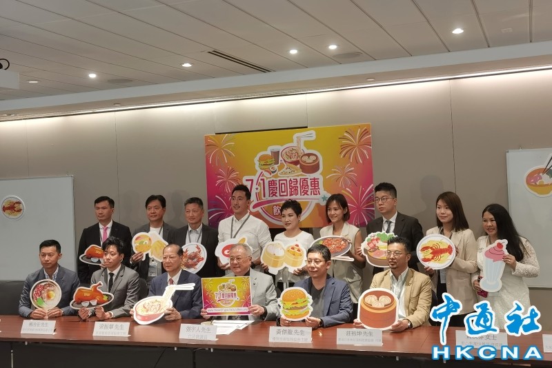 香港中通社6月26日電(記者 譚暢)為慶祝香港回歸祖國27周年,香港飲食界舉辦“7.1慶回歸優惠活動”,全港約2000間商戶均有參與。香港飲食界立法會議員張宇人26日在記者會上介紹活動詳情。
