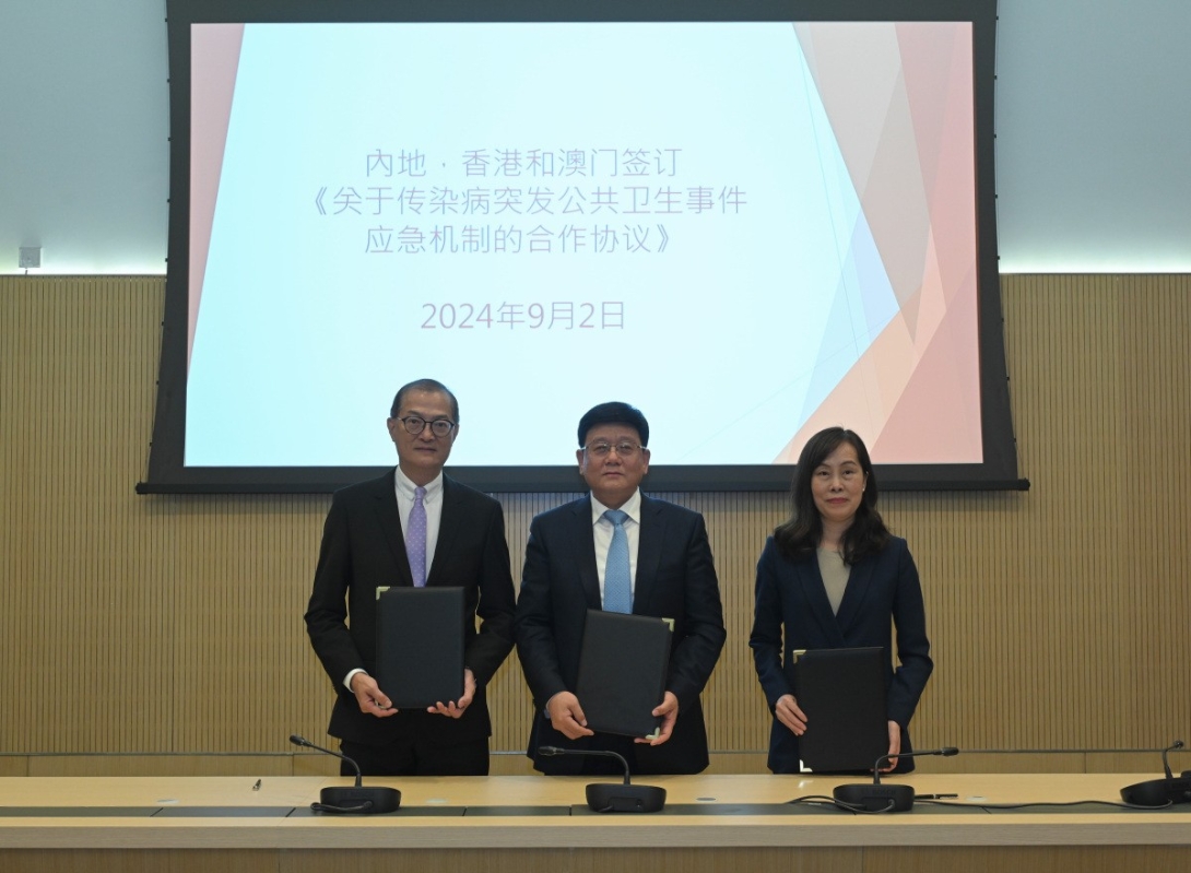 香港中通社9月2日電 2日,香港特區政府醫務衞生局局長盧寵茂、國家疾病預防控制局局長王賀勝、澳門特區政府社會文化司司長歐陽瑜在香港會面,並簽署《關於傳染病突發公共衞生事件應急機制的合作協議》,以加強內地、香港特區和澳門特區在應對重大傳染病突發公共衞生事件時的合作與交流。