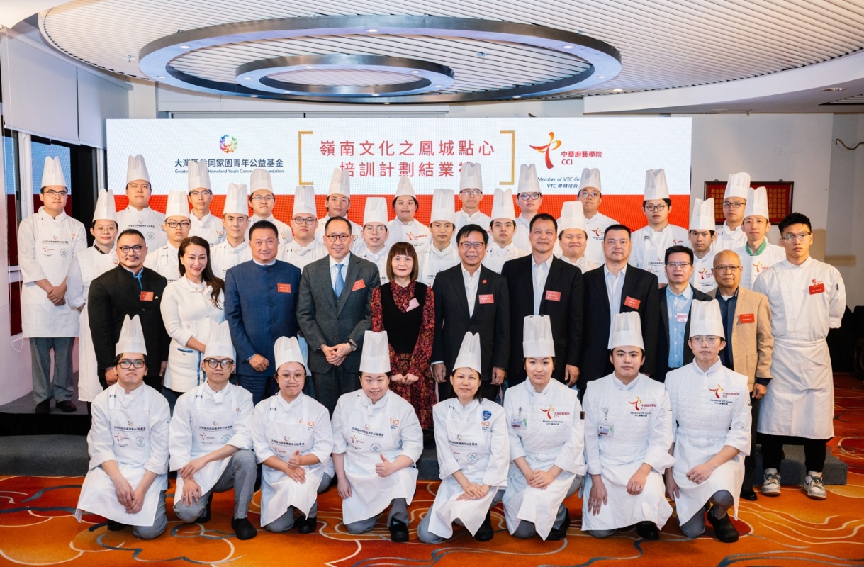 香港新聞網11月25日電 為鼓勵香港青年提升技能、開拓機遇,大灣區共同家園青年公益基金(大灣區青年基金)與中華廚藝學院首次合作,早前舉行了“嶺南文化之鳳城點心培訓計劃”,率領逾30名中華廚藝學院師生赴有“中國廚師之鄉”之稱的順德,於順德職業技術學院烹飪學院學藝。為表揚及展示學生的努力成果,特意於11月22日舉行結業禮及晚宴,邀請一眾嘉賓親臨見證。 當晚出席嘉賓包括香港特區政府政制及內地事務局粵港澳大灣區發展專員陳潔玲,香港特區政府民政及青年事務局青年專員陳瑞緯,中聯辦青年工作部二級巡視員張國來,大灣區共同家園青年公益基金主席、信和集團副主席黃永光,中華廚藝學院院長葉漢鵬,大灣區共同家園青年公益基金顧問、港區全國人大代表陳振彬,大灣區共同家園青年公益基金副主席、帝盛酒店集團總裁邱詠筠,順德區委統戰部、順德區歸國華僑聯合會主席吳蔚,以及擔任今次計劃導師的順德名廚等。