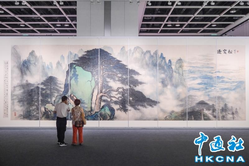 他提到,改革開放後的新藝術家作品,體現出祖國大好河山;今天新一代藝術家的作品則體現繁榮景象,人民的生活、洋溢的喜悅在畫面上體現出來,整個展覽非常完整的體現出嶺南藝術傳承和發展。“其命惟新”主題也體現了使命感,特別適合廣東省,廣東百年來出了很多改革維新的一代大師。 他提別提到,今天嘉賓證是黎雄才大師的作品,黃山的迎客松,迎客松代表迎客,客人來到非常歡迎很高興的意思,所以特意用這張畫印在媒體證上。 他指出,香港地處嶺南一帶,藝術同根同源。香港藝術愛好者能通過展覽了解到嶺南藝術對他們的滋養;今年又是抗戰勝利80周年,展覽的作品有老一代藝術家用他們的刀和筆來抗戰,觀眾都能看得見感受到,回憶當年,今天的和平幸福生活來之不易。