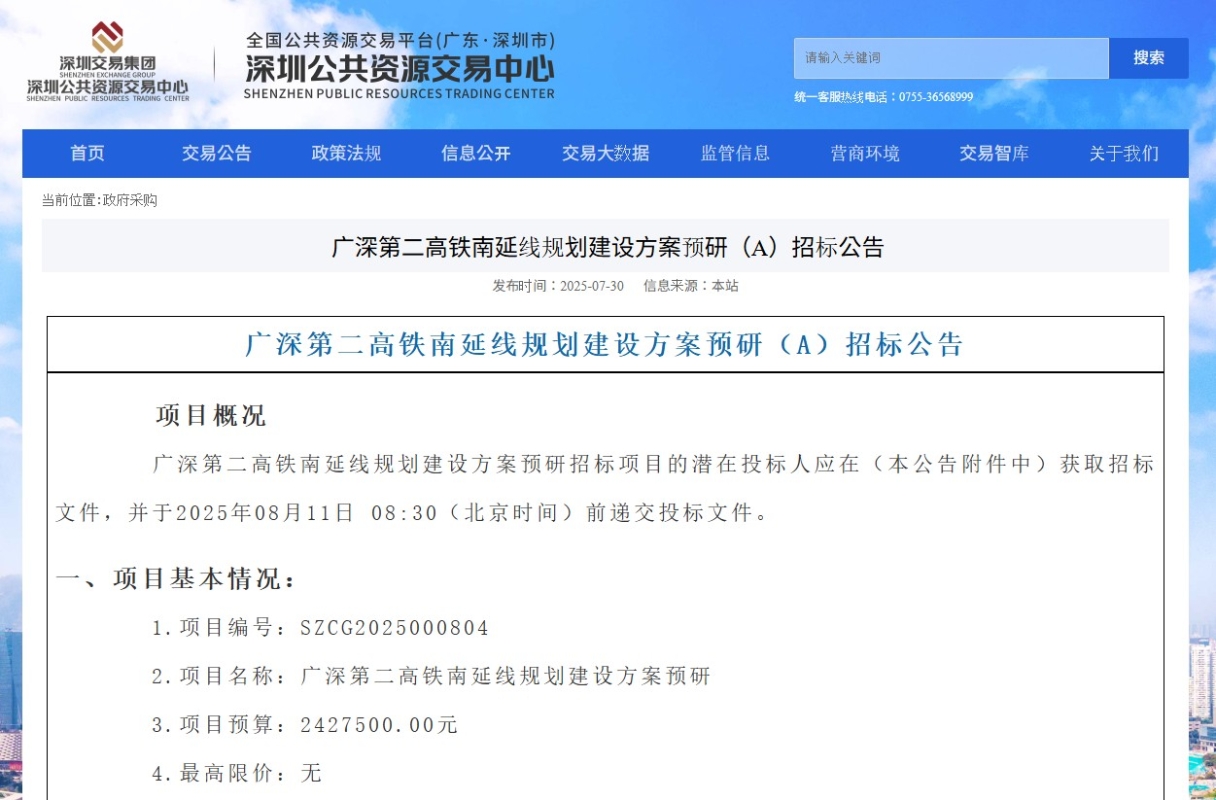 截圖自深圳公共資源交易中心 根據《粵港澳大灣區發展規劃綱要》,大灣區將通過“港澳廣深”極點帶動、高品質基礎設施軸帶支撐,建設世界級城市群。現狀深港對外戰略通道能力嚴重不足,制約深港聯動。結合國家鐵路深圳地區樞紐總圖規劃,深港之間350公里時速僅布局1條廣深港高鐵。廣深第二高鐵是可延伸至香港的唯一通道。若不延伸,廣深港深港段飽和運行,香港需利用深圳車站出行,將嚴重影響深圳鐵路能力。 目前,機場東樞紐正在開展工程設計,計劃2025年開工。按照樞紐建設方案,北端已預留廣深第二高鐵接入條件,南端因缺乏上位規劃依據未預留繼續延伸條件。2023年7至8月,國鐵集團和廣東省發改委先後啟動了深圳地區鐵路樞紐總圖修編和粵港澳大灣區多層次軌道交通研究,為廣深第二高鐵延伸納入上位規劃提供了契機。為此,啟動本次廣深第二高鐵南延線規劃建設方案預研工作。 項目研究內容包括港深發展現狀和趨勢分析、現狀港深軌道布局分析、需求分析、廣深第二高鐵南延必要性論證、線路功能定位及主要技術標準、線站位方案研究等。 值得注意的是,從目前已披露的信息來看,廣深第二高鐵南延線線路很可能與港深西部鐵路協同,進一步密切香港與內地的聯繫。 港深西部鐵路全長約18.1公里,香港段及深圳段分別長約7.3公里及10.8公里。全線以地下形式興建,共設有5個車站,香港境內設有3個車站,分別位於洪水橋、厦村及流浮;深圳境內設有2個車站,分別位於深圳灣口岸及前海灣。港深雙方同意將“一地兩檢”口岸設於深圳。 港深西部鐵路將打通港深兩地西部的地鐵網絡,屆時,從香港洪水橋直達深圳前海只需約15分鐘,有利構建粵港澳大灣區一小時生活圈,方便兩地居民跨境商貿、工作、居住、學習及旅遊。港深西部鐵路亦是推動香港北部都會區發展的重要運輸基建設施,計劃2035年開通。 作為廣深港第二高鐵的起始站,深圳機場東綜合交通樞紐地處前海中心區、國際會展城兩大平台之間,是集航空、高鐵、城軌、地鐵多位一體的“空鐵聯運、站城一體”綜合交通樞紐。深圳機場東樞紐引入深江鐵路、廣深第二高鐵,國鐵規模6台14線,同時包含T1航站樓、4條地鐵線(1、12、20、26號線)等多種交通接駁設施,是重大路地合作項目。 根據規劃,深圳機場東站預計2027年完工。(完) 【編輯:劉春】