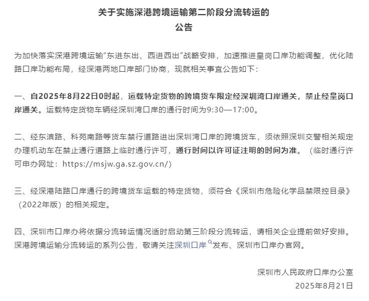 香港新聞網8月21日電 深圳市口岸辦8月21日發布公告稱,為落實深港跨境運輸“東進東出、西進西出”戰略安排,加速推進皇崗口岸功能調整,優化陸路口岸資源配置,經深港兩地口岸部門協商,自2025年8月22日0時起,對跨境貨車通行安排做出系列調整。