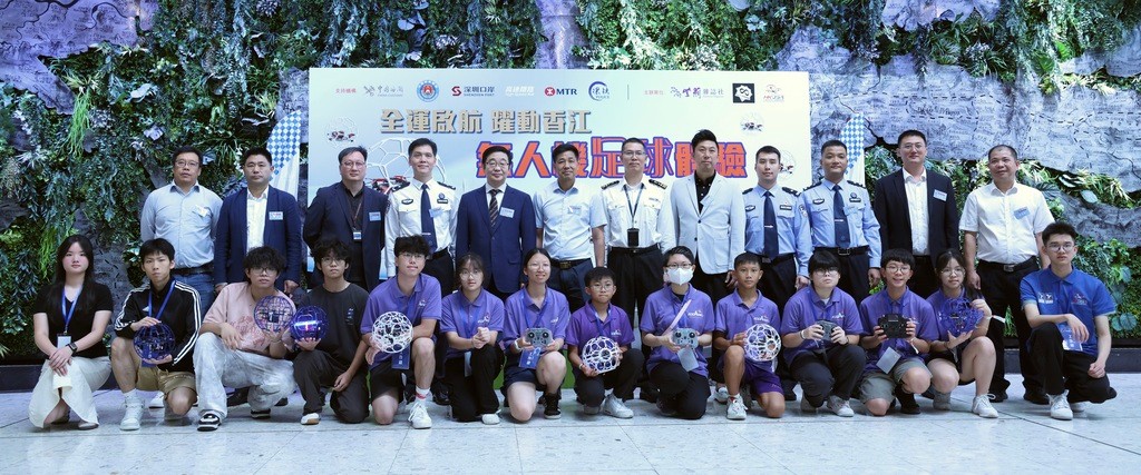 主禮嘉賓與參賽選手合影。紫荊網 紫荊文化集團副總經理丁偉,深圳市人民政府口岸辦公室陸路口岸處副處長侯永軍,西九龍出入境邊防檢查站站黨委委員、副站長石正全,西九龍站海關黨委委員、副關長梁傑,紫荊雜誌社社長楊勇,香港鐵路有限公司西九龍站營運主管許振聲,中國香港無人機運動總會主席鄒偉傑,8 Zone Production 主席蘇永耀,西九龍出入境邊防檢查站邊防檢查處副處長吳嗣爵,西九龍站派出所所長吳佳卿,西九龍站口岸管理服務中心經理鄧培烽,西九龍站口岸管理服務中心黨支部書記吳連鎮等主禮嘉賓出席。