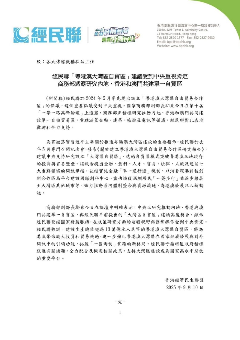 香港新聞網9月10日電 香港經民聯10日表示,於2024年5月率先提出設立“粵港澳大灣區自由貿易合作區”的倡議,該重要倡議受到中央重視。中國商務部副部長鄢東當日在第十屆“一帶一路高峰論壇”上透露,商務部正積極研究推動內地、香港和澳門共同建設單一自由貿易區,重點涵蓋金融、建築、旅遊及電訊等領域。經民聯對此表示歡迎和全力支持。