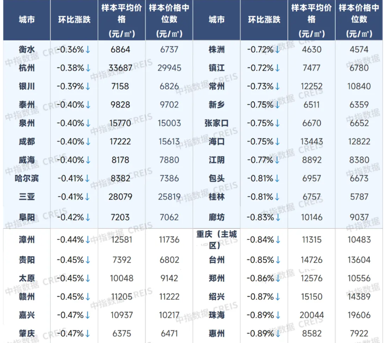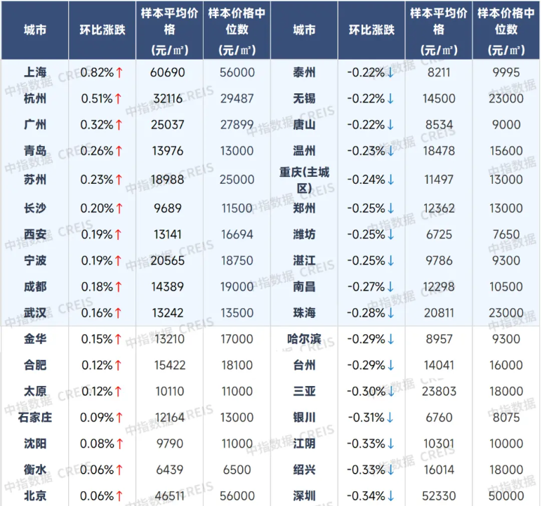 9月百城新建住宅價格及環比漲跌幅(圖源:中指研究院) 具體來看,上海(+0.82%)、杭州(+0.51%)、廣州(+0.32%)、青島(+0.26%)、蘇州(+0.23%)等城市新建住宅價格環比漲幅靠前。 與之形成鮮明對比的是,三四線代表城市去庫存方面仍然乏力,9月新建住宅價格環比下跌0.35%,同比下跌1.30%,前9個月纍計跌幅達1.23%,“降價跑量”仍是多數項目的主要去化策略。 其中,汕頭(-1.23%)、柳州(-0.91%)、馬鞍山(-0.87%)、德州(-0.86%)、南通(-0.86%)等城市新建住宅價格環比跌幅靠前。 曹晶晶指出,核心城市推盤積極性提升是帶動新房價格結構性上漲的關鍵因素。9月上海、深圳等核心城市加大優質改善型項目推出力度,部分項目結合政策優化實現品質升級。 以上海為例,9月發佈的住宅品質提升政策明確提出,可局部提高建築高度并放鬆陽台計容面積計算規則,該政策提升了高端項目的市場接受度。同時,成都、武漢、合肥等地也在完善住房項目計容規則,為“好房子”建設提供政策支撐,進一步激活了改善性需求。 曹晶晶表示:“目前百城新房均價環比微漲,主要是受近兩年土地供應回歸主城叠加新房產品改善化趨勢帶動。但9月百城中仍有67個城市新房價格環比下跌,可以看出多數城市房價依然承壓。‘銀十’期間,房企在核心城市推盤預計將維持溫和恢復態勢,有望對新房價格形成一定支撐。” 二手住宅市場仍處於深度調整期 與新建住宅價格結構性上漲形成對比的是,9月百城二手住宅市場仍處於深度調整期,價格連續第41個月環比下跌。 數據顯示,9月百城二手住宅均價為13381元/平方米,環比下跌0.74%,同比下跌7.38%;第三季度,百城二手住宅價格累計下跌2.26%,跌幅較二季度擴大0.14個百分點;前三季度, 百城二手住宅價格累計下跌5.79%,市場調整幅度持續加深。