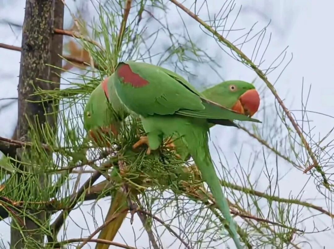 圖源:大灣區之聲 亞歷山大鸚鵡是由外地引入香港品種,見於九龍公園。全長約42厘米,與紅領綠鸚鵡十分相似,特徵是紅領、紅肩和黃眼睛,以果實、種子和花蜜為食物。 不少深圳市民社交平台上分享照片,有網友表示,這印證了“鸚鵡都知道深圳有好東西吃”。