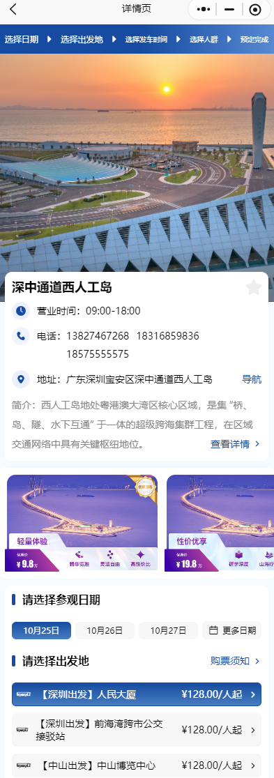 “整個西人工島的文旅運營開發分階段進行,首期主要圍繞島上設立的粵港澳大灣區跨海通道科普基地開展研學、觀光。”項目運營方深圳文旅產業發展有限公司陳海亮介紹,自10月25日起,將啟動為期一個月的運營前壓力測試。逢周一到周五定點面向企業和研學團體預約,周六、周日面向社會公眾個人預約。