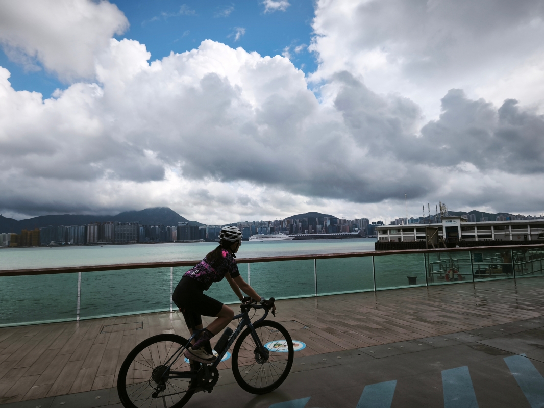 市民在即將舉辦鐵人三項賽事的中環海濱騎單車