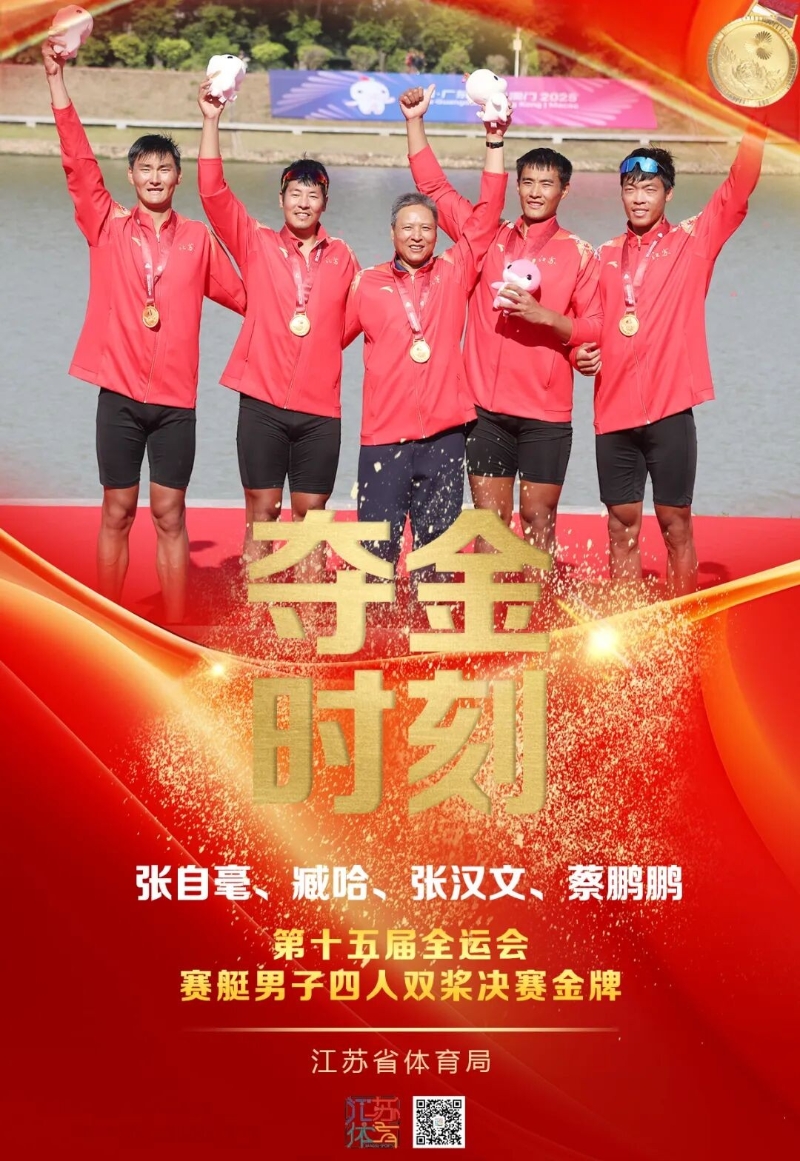 圖源:江蘇省體育局 當天上午,第十五屆全運會賽艇項目決賽在位於廣州白雲的廣東國際划船中心舉行,江蘇運動員張自毫、臧哈、張漢文、蔡鵬鵬以4分12秒24的成績奪得男子四人雙槳金牌。 在頒獎環節中,江蘇省代表團團長陳忠偉為獲獎運動員、教練員頒發獎牌。江蘇省代表團副團長劉建向獲獎運動員、教練贈送本屆全運會吉祥物“喜洋洋”“樂融融”。 在同天結束的賽艇女子四人雙槳決賽中,江蘇運動員徐懿汐、丁佳雯、鄭佳瑤、朱虹以4分38秒49的成績為江蘇代表團再添一枚銅牌。(完) 【編輯:梁嘉軒】