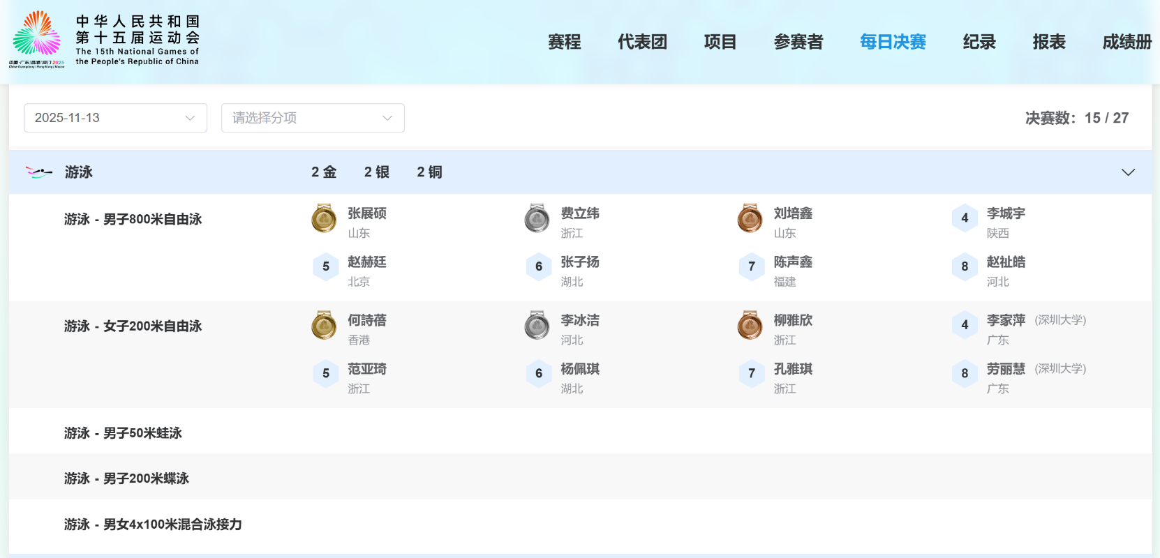 十五運會賽果截圖 她在12日晚的準決賽以總成績第二名晉級,賽後接受訪問時表示,相信在決賽可以再游快些。 香港特區政府文化體育及旅遊局局長羅淑佩傍晚發稿,熱烈祝賀中國香港游泳運動員何詩蓓於奪得女子200米自由泳金牌。羅淑佩說:“何詩蓓表現出類拔萃,憑着非凡實力和堅毅鬥志勇奪金牌,展現了香港運動員的風采。我和全港市民一樣,為她感到十分驕傲,亦祝願她在餘下賽事再創佳績。” 港隊至今在十五運會帆船、自行車、網球和游泳項目共取得四面獎牌,包括三金一銅。(完) 【編輯:梁嘉軒】