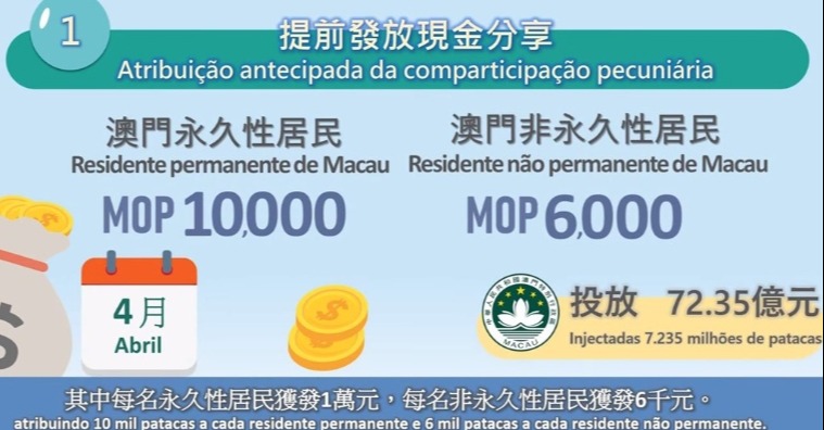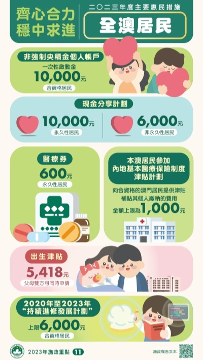 澳門大三巴牌坊。香港中通社資料圖片 期內,入境旅客達2967萬人次,國際旅客錄189萬人次,分別增長14.5%和12.4%。7月至9月期間,總體失業率和本地居民失業率分別為1.8%和2.4%,皆維持低位。截至9月底,政府財政儲備資本金額為6580億元。 惠民生方面,合資格非永久性居民可派錢6000元,醫療券維持700元,並向每名合資格居民的非強制央積金個人賬戶額外注資7000元。澳門居民參加內地醫保制度津貼計劃,範圍擴展至廣東全省及福建省,補貼上限1000元。 此外,結婚津貼調升至4000元,合資格配偶雙方可同時領取;失業津貼調升至每日210元;喪葬津貼亦調升至5200元,疾病津貼亦調升。敬老金則維持每年1萬元,養老金每月3900元;會繼續發放育兒津貼。 岑浩輝指出,總體來看,澳門經濟復甦和經濟適度多元發展穩步推進,橫琴粵澳深度合作區建設取得新進展,社會民生工作逐步優化,區域合作持續加強,特區經濟社會發展穩中有進,主要施政目標任務基本落實。(完) 【編輯:胡雪石】