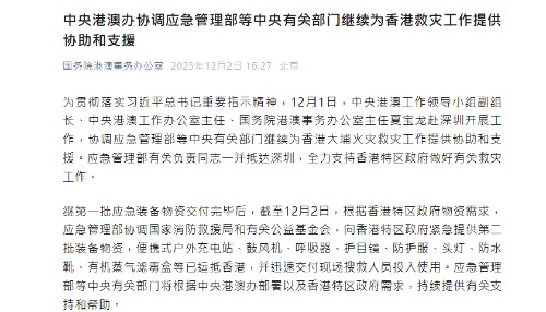 香港新聞網11月28日電 為貫徹落實習近平總書記重要指示精神,中央港澳辦協調廣東省為香港大埔火災救災工作提供協助和支援。 據港澳辦公布,根據香港特區政府提出的需求,廣東省迅速調集有關救援裝備和醫療物資及耗材,分別於11月27日晚上和28日上午交付香港方面。