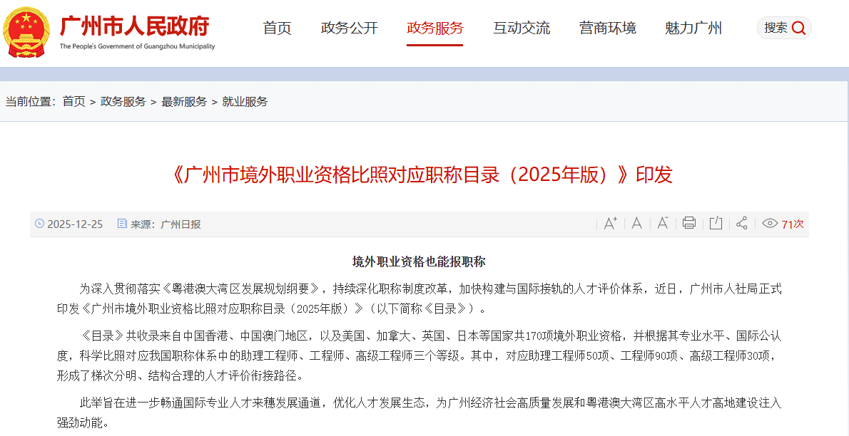 圖片來源:廣州市人民政府網站截圖 文章指出,上述境外職業資格將根據其專業水平、國際公認度,科學比照對應中國內地職稱體系中的助理工程師、工程師、高級工程師三個等級。其中,對應助理工程師50項、工程師90項、高級工程師30項,形成了梯次分明、結構合理的人才評價銜接路徑。 本次發布的《目錄》緊密圍繞廣州“産業第一、製造業立市”的戰略部署以及現代化産業體系的構建需求,覆蓋信息技術與人工智能、工程建設與建築交通、先進製造與自動化、生物醫藥與大健康、綠色環保與可持續發展,以及能源化工與材料等6大賽道的人才。 其中,就工程建設與建築交通,《目錄》收錄46項境外職業資格,覆蓋建築設計、土木工程、城鄉規劃、工程測量等專業,納入了香港測量師、建築師、規劃師等資格,英國皇家特許測量師(RICS)、特許工程師(CEng)等國際通行資格,鞏固提升廣州在城市建設與管理方面的國際化水平。(完) 【編輯:林曉惠】