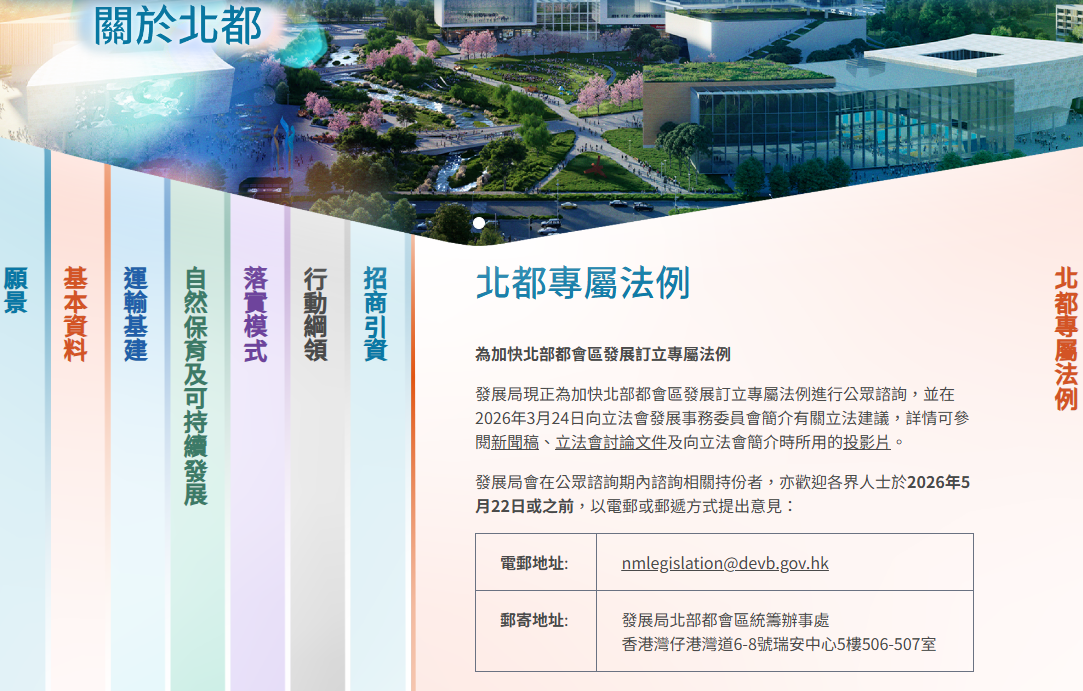 發展局早前已發出立法會文件,建議為加快北都發展訂立專屬法例,目標是進一步為北都規劃和地政程序拆牆鬆綁、加快工程建設及助力產業營運。擬議專屬法例建議由主體法例設定主線框架,並授權行政長官會同行政會議可按需要,就六個指明範疇進一步訂立附屬法例:(一)簡化城市規劃程序;(二)加快支付被收回土地的補償;(三)便利採用創新的建築技術安排;(四)簡化申請建築噪音許可證的程序及要求;(五)便利及管理跨境要素流動;以及(六)就指定地區成立法定公司,目標是於今年年中向立法會提交主體法例的條例草案供審議,同時提交首批附屬法例的草擬本供預覽。發展局會爭取主體法例年內獲得立法會通過,然後向立法會正式提交主體法例下首批附屬法例供立法會審議。詳情可參閱立法會討論文件。 公眾及各界人士可於今年五月二十二日或之前,以電郵或郵遞方式就擬議專屬法例提出意見。有關資訊載於發展局北部都會區專題網站。 電郵地址:nmlegislation@devb.gov.hk 郵寄地址:發展局北部都會區統籌辦事處(香港灣仔港灣道6-8號瑞安中心5樓506-507室)(完) 【編輯:譚暢】