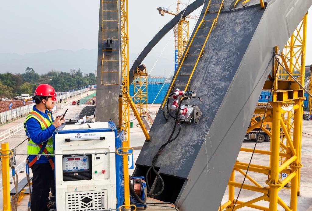 工人在操作智能焊接機器人進行高空焊接作業(無人機照片)。新華社資料圖