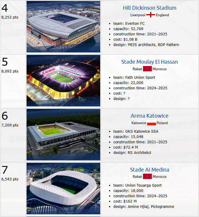 從公佈的榜單來看,北非國家摩洛哥依託籌辦大賽的狂熱足球氛圍與較高的國民關注度,強勢包攬冠亞軍;造價超十億美元的英超埃弗頓全新主場位列第四。
