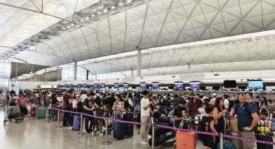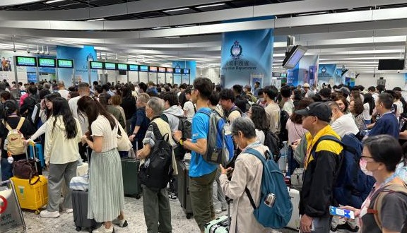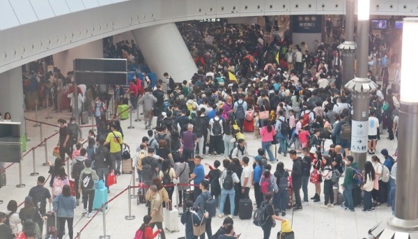 當天下午的西九龍高鐵站,大堂擠滿等候入閘的乘客,拖著大大小小的行李箱。“今天大部分開往內地的列車車票均已售出,尚未購票的旅客可經羅湖、落馬洲口岸前往內地。”車站現場以粵語、普通話及英語三語反覆廣播,並提醒旅客預留充足時間入閘。