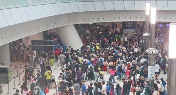 內地遊進一步火熱,香港西九龍高鐵站當天擠滿準備出發的旅客。整個候車大堂除少部分被框起用作登車閘口的空間外,其餘地方均站滿旅客。港鐵公告指,港鐵經與內地鐵路部門商討後,高鐵香港段在2日至7日期間加強來往香港西九龍站及深圳福田站的列車服務,每日最多加開13對列車;假期期間亦有5對來往香港與貴陽、潮汕、南昌、桂林及張家界的旅遊專列,由旅遊業界包團前往旅遊勝地。