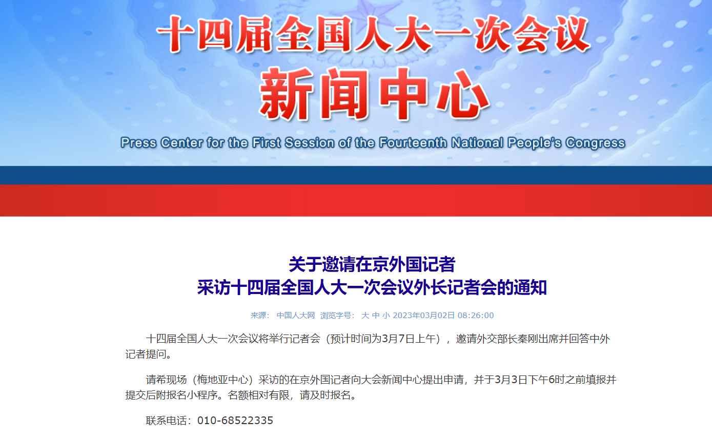 香港新聞網3月2日電 據中國人大網消息,十四屆全國人大一次會議新聞中心2日發布《關於邀請在京外國記者採訪十四屆全國人大一次會議外長記者會的通知》:十四屆全國人大一次會議將舉行記者會(預計時間為3月7日上午),邀請外交部長秦剛出席並回答中外記者提問。