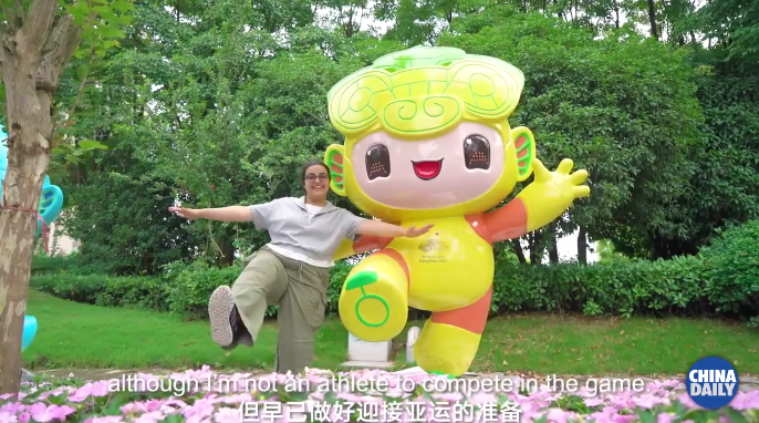 Sara與城市中隨處可見的亞運會裝飾合影 據中國日報網報道,杭州第19屆亞運會將於9月23日晚間拉開帷幕,主辦城市杭州和協辦城市寧波是與薩拉成長息息相關的兩個地方。她表示,她很喜歡這兩座城市,自己更是寧波美食愛好者,尤其鐘愛糯嘰嘰的點心。