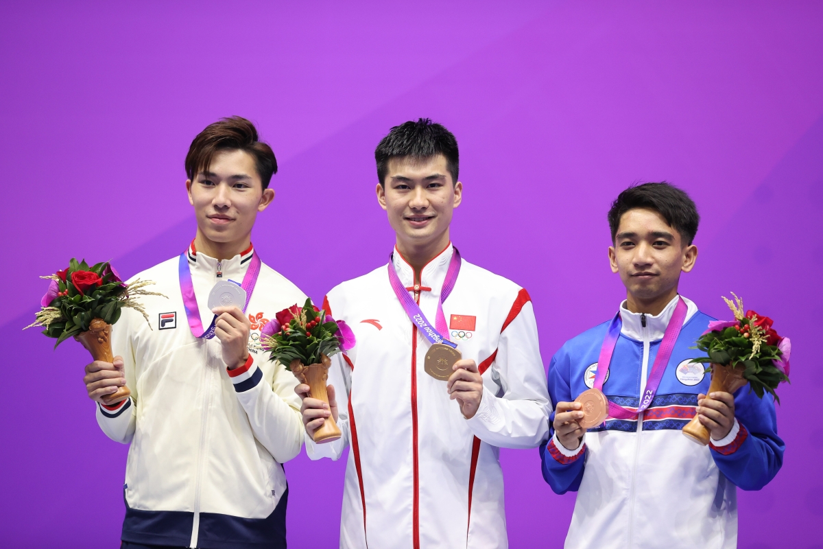 中國國家隊選手高浩楠(中)摘得金牌,中國香港選手許得恩(左)獲得銀牌,菲律賓選手(右)獲得銅牌