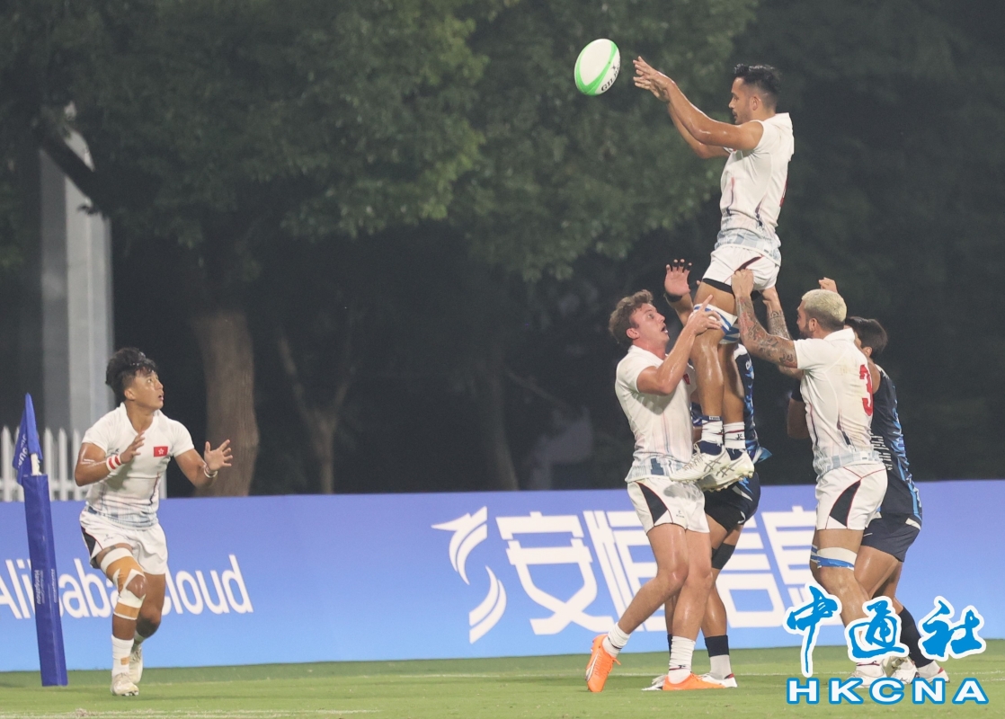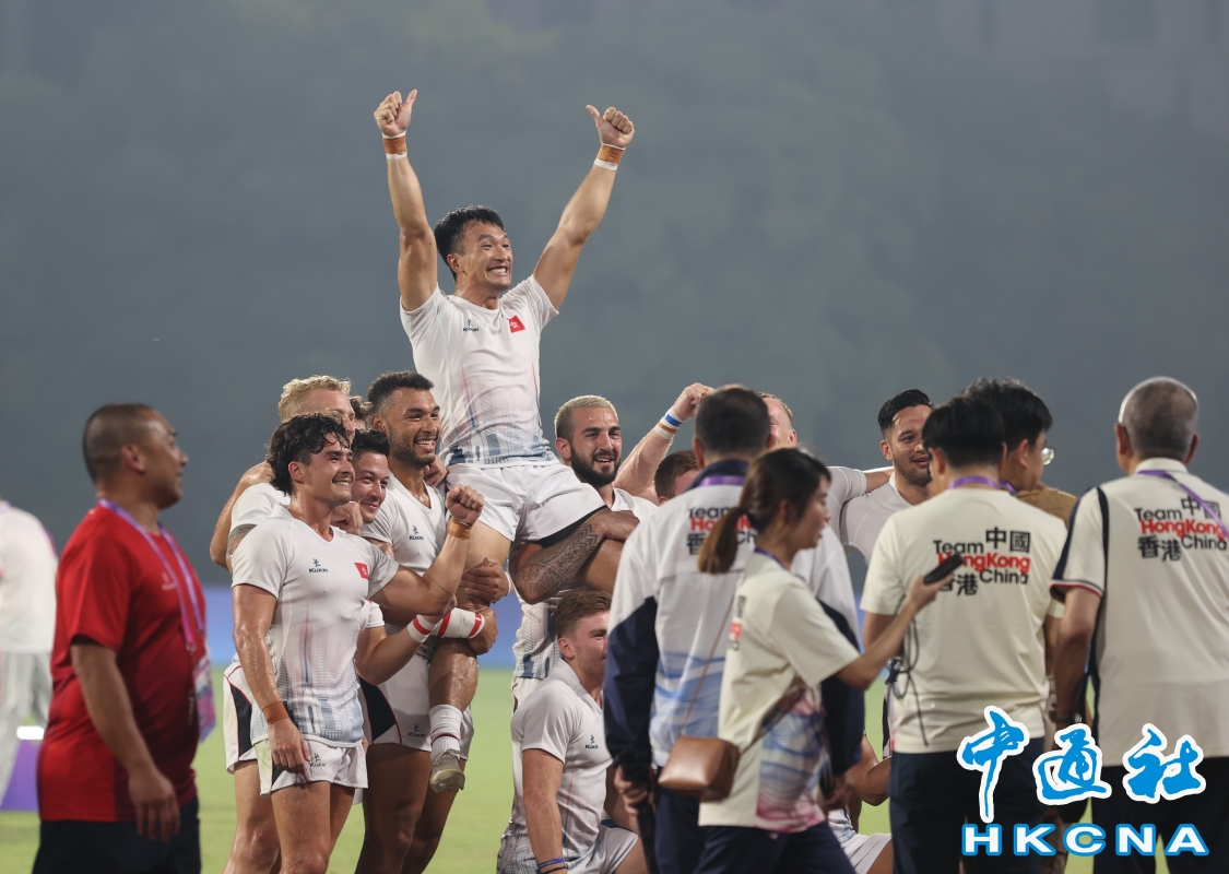 (香港中通社記者 洪少葵 攝) 即將退役的“四朝元老”姚錦成賽後表示,難以形容衛冕的感受,仍沉醉其中。成功衛冕反映港隊再上一台階,證明一眾球員能夠控制著壓力。李卡度則指,很開心能成功衛冕,但決賽中亦有細節未做得好,對奪金感到滿足。 香港男子七人欖球隊在上一屆雅加達亞運會創歷史,在決賽中奪冠,突破上兩屆只得銀牌的宿命。出征杭州亞運前,球隊就下決心以衛冕為目標,上一屆冠軍隊員中,有8人繼續迎戰。