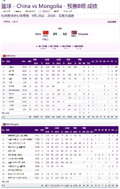 香港新聞網9月27日電 9月26日,杭州亞運會男子籃球小組賽中,中國男籃89-50戰勝蒙古男籃。 其中,胡明軒8分,趙繼偉5分5籃板,程帥澎5分,趙睿10分4籃板,崔永熙16分4籃板,胡金秋13分6籃板4助攻,王哲林6分4籃板,張鎮麟20分11籃板4搶斷。 本屆亞運會男子籃球項目共有16支參賽隊,分為4個小組,中國男籃本屆比賽小組賽對手為蒙古 (FIBA世界排名第100名) 、中國台北 (FIBA世界排名第78名) 和中國香港 (FIBA世界排名第119名) 。根據規則,每個小組的第一名進入四分之一決賽,小組二、三名將通過資格賽決出另外四個四分之一決賽名額。