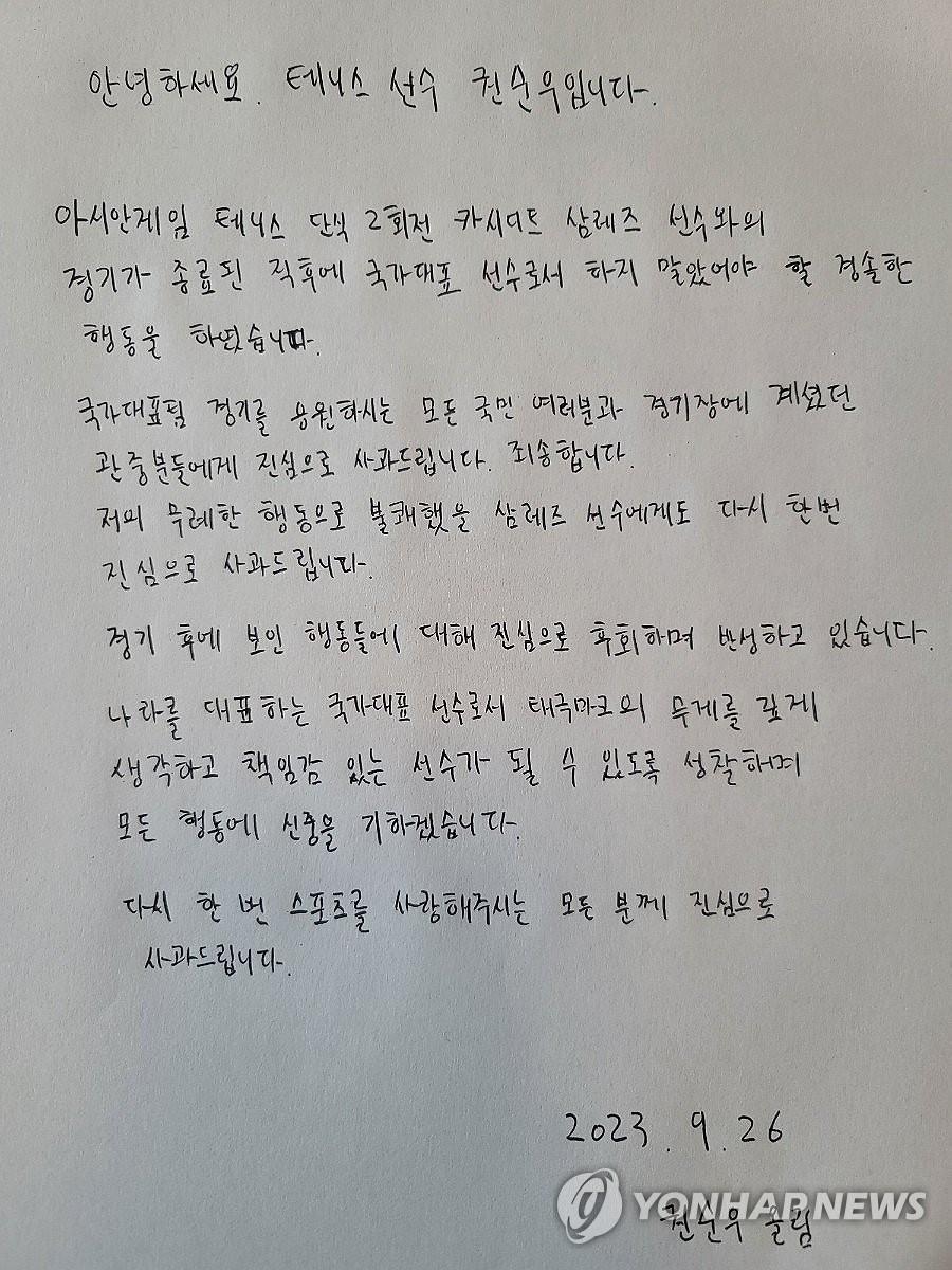 香港新聞網9月27日電 此前爆冷輸球的韓國網球一哥權純雨,在亞運賽後拒絕與泰國對手握手,且怒摔球拍,引發極大爭議。26日,他以韓國文娛明星的慣用方式——親筆道歉信,向球迷們表達了歉意。 據觀察者網綜合報道,權純雨在26日通過大韓體育會公開了一封親筆道歉信。他在信中表示,“作為國家代表選手,做出了不該做的輕率行為”。“我向所有支持國家代表隊比賽的國民和在場觀眾表示真誠的歉意。對不起。” 他補充道,“再次向因我的無禮行為而感到不快的甲西迪·訕雷選手錶示誠摯的歉意。”