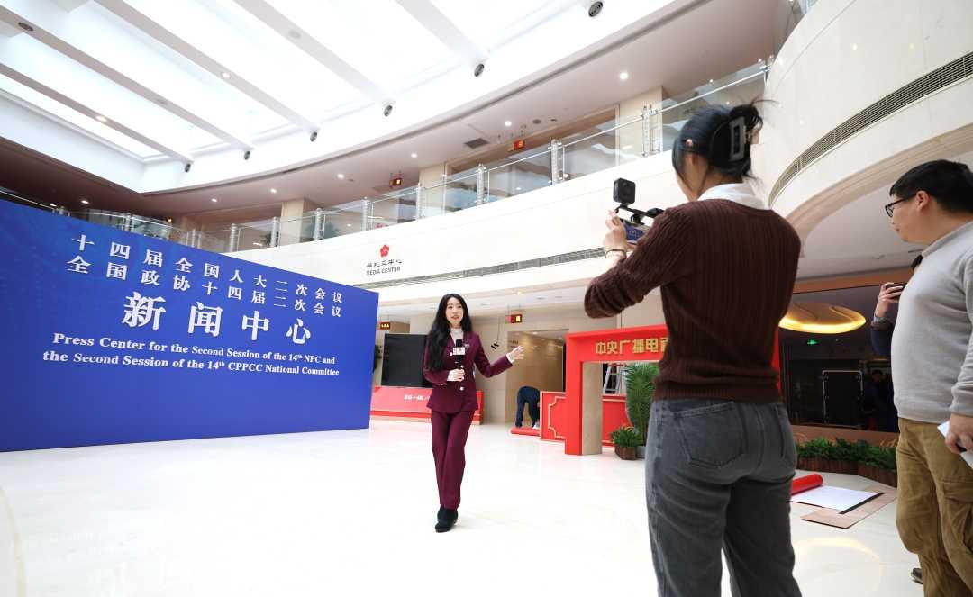 2月27日,位於北京梅地亞中心的全國兩會新聞中心,媒體記者在出鏡報道。來源:經濟日報