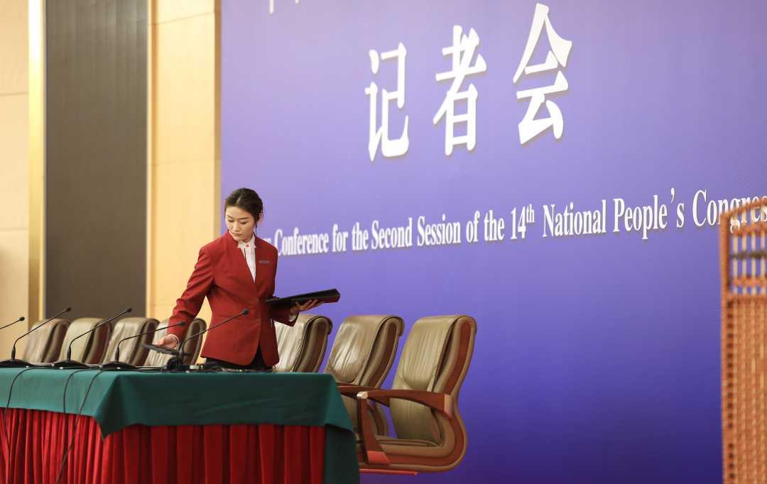 2月27日,位於北京梅地亞中心的全國兩會新聞中心新聞發佈廳,工作人員在擺放設備。來源:經濟日報