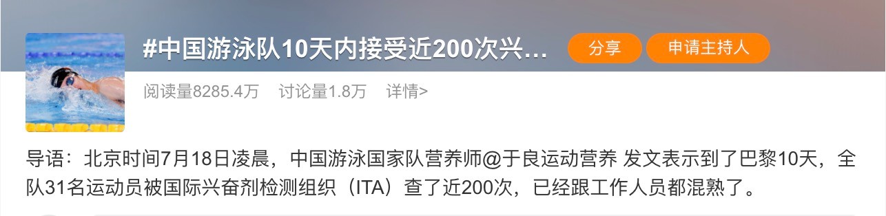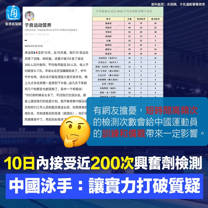 香港新聞網7月19日電 巴黎奧運會開幕在即,“中國游泳隊10天內接受近200次興奮劑檢測”的話題登上卻微博熱搜,閱讀量超過8000萬次。