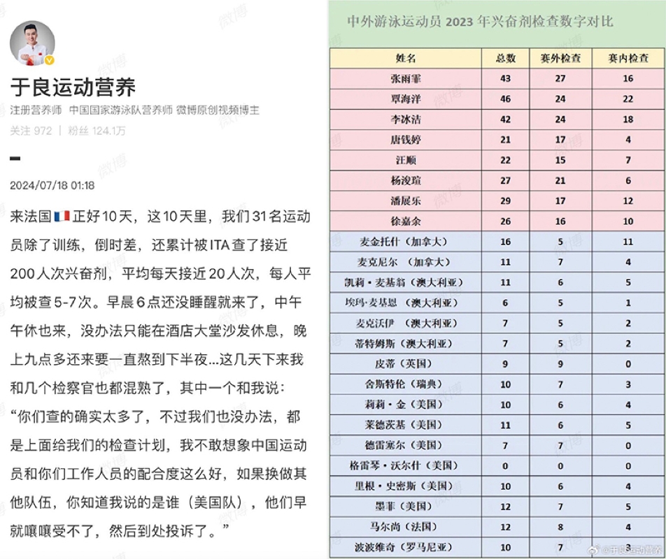來源:“于良運動營養”微博截圖 據報道,過去一年,中國泳隊選手接受興奮劑檢測次數遠超國外運動員。在反興奮劑機構公佈的“2023年興奮劑檢測次數”排名前50的運動員中,中國選手佔了32個,美國4個,加拿大3個,澳大利亞0個。中國 “蛙王”覃海洋去年興奮劑檢查數量達到46次,一人的檢查次數相當於4到5位外國奧運冠軍的總和;東京奧運會兩金得主張雨霏去年共接受43次國內國際興奮劑檢查,包括27次賽外和16次賽內檢查。而在6月舉行的美國奧運選拔賽中爆冷打破女子100米蝶泳世界紀錄的21歲美國泳將格雷琴·沃爾什,去年接受興奮劑檢查的次數竟然為0。 對此,有網友擔憂,短時間高頻次的檢測次數會給中國運動員的訓練和備戰帶來一定影響。 為何國際興奮劑檢測組織在巴黎奧運會前集中對中國游泳隊進行密集檢查? 早前,有外國媒體報道稱,中國有多名游泳運動員在2021年被查出興奮劑曲美他嗪陽性卻沒有受到處罰。對此,世界反興奮劑機構表示,中國反興奮劑中心在事件發生後及時通報了該結果,並根據調查作出污染造成陽性的結論,經過世界反興奮劑機構詳盡審查後認可這一結論,因此報道具有“誤導性和潛在誹謗性”。 瑞士獨立檢察官覆核亦同意世界反興奮劑機構的處理“無偏頗”,但美國就引用國內法介入調查。