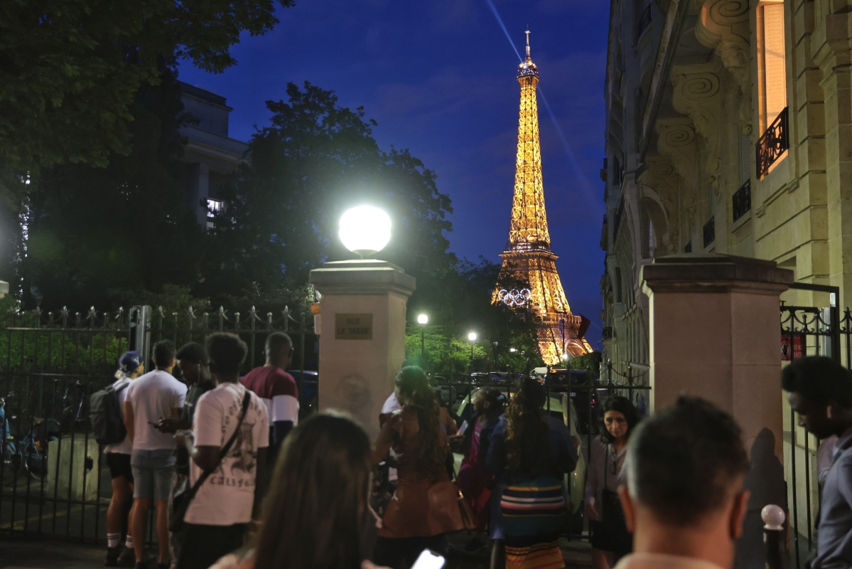 奧運會開幕式臨近,塞納河岸實施管制措施,不少遊客在管制區外欣賞埃菲爾鐵塔