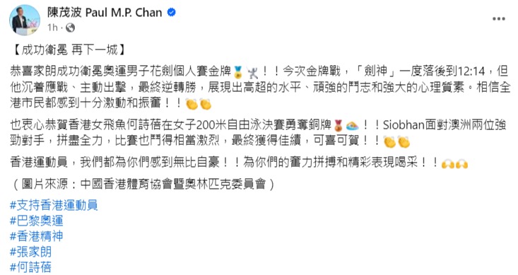 (巴黎奧運)香港各界賀張家朗何詩蓓為港摘金奪銅分享到: