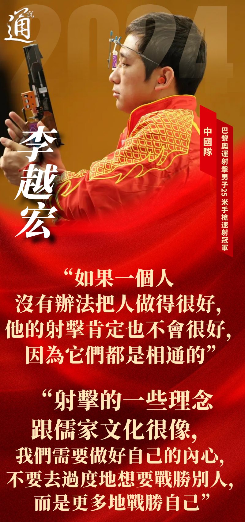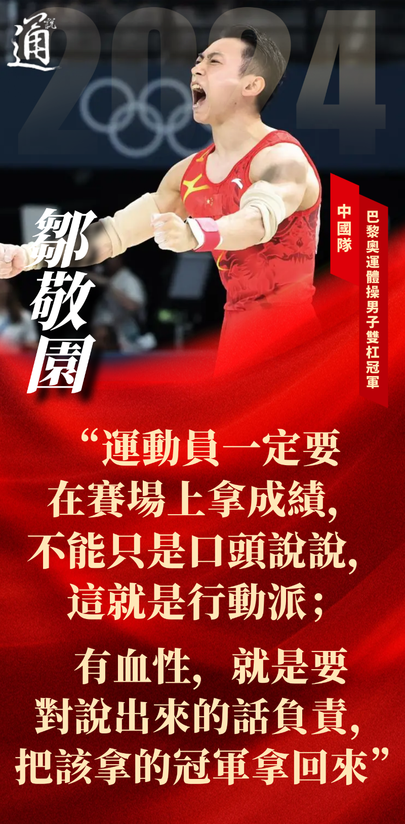 (香港新聞網製圖) 5日的體操男子雙杠決賽中,中國選手鄒敬園憑藉完美流暢的發揮,拿下全場最高分16.200,領先第二名0.7分,以壓倒性優勢衛冕。 “行動派!有血性!”是中國體操隊訓練場上的一句標語。對此,鄒敬園這樣理解,“運動員一定要在賽場上拿成績,不能只是口頭說說,這就是行動派;有血性,就是要對說出來的話負責,把該拿的冠軍拿回來。” 鄒敬園將此標語奉為信念,並用實際行動將其踐行。他的肩部一直有傷,連日來的訓練和比賽使他的身體幾乎達到極限,但他仍堅持上陣,最終續寫傳奇。 “如果現在是訓練的話,我肯定是練不了的,但這是在比賽。”走下賽台,鄒敬園立刻把冰袋敷在右肩上。 本屆奧運,中國體操男隊本有希望奪得男團冠軍,然而因為失誤,金牌失之交臂。遺憾氛圍下,“雙杠王”鄒敬園奪下一金,為中國體操正名。 “作為運動員,我覺得一定要有追求,特別是覺得自己有實力、有優勢的,要拿得下,機會在那邊要抓得住。”鄒敬園說。 展望未來,這位“雙杠王”希望自己能對體操項目的發展做出貢獻,讓體操在奧運會舞台上證明它的價值。 5日亦是本屆奧運會射擊比賽的最後一天。老將李越宏以一枚射擊男子25米手槍速射金牌,幫助中國射擊隊以5金圓滿收官。 前兩屆奧運會射擊男子25米手槍速射比賽中,李越宏均獲得銅牌。這次在巴黎,已過而立之年的他終於完成幾代教練員和隊員的夙願,拿到中國射擊隊在這一項目上的首枚奧運金牌。打完最後一輪,李越宏與教練張建偉相擁而泣。 “所有的突破都是一步一步積累來的,”奪冠後的李越宏感慨萬千,“我們之前所有的前輩們,他們也是非常不錯的優秀運動員,我只是繼承了他們的一些精華,加上了一點自己的提煉。” 能擁有這樣謙虛低調的心態,和長期練射擊不無關係。賽前賽後,李越宏多次提到 “射以觀德”,認為射擊與人品息息相關。 “如果一個人沒有辦法把人做得很好,他的射擊肯定也不會很好,因為它們都是相通的。”他在賽前表示,練習射擊需要一種謙虛的狀態,練的時間越長,“遇到問題的時候,你可能也不會特別著急,會慢慢地去思考、理順。” 奪冠後,李越宏又說,“我覺得射擊的一些理念跟儒家文化很像,我們需要做好自己的內心,不要去過度地想要戰勝別人,而是更多地戰勝自己。”