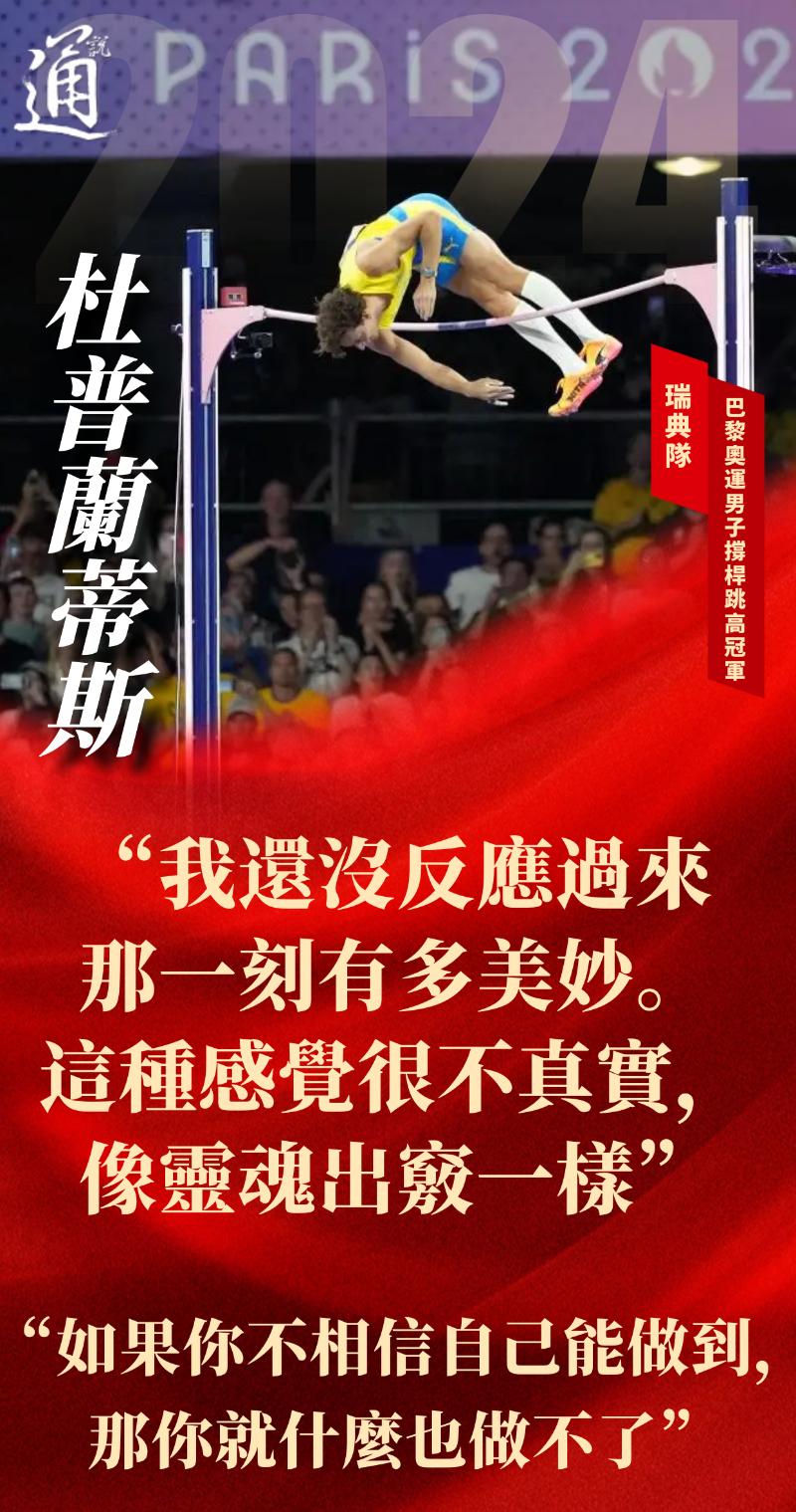 (香港新聞網製圖) 當日的奧運賽場,瑞典名將杜普蘭蒂斯也通過打破自己的撐桿跳高的世界紀錄的方式,戰勝了自己。他向6米25的高度發起衝擊時,前兩次均試跳失敗,直到最後一次機會,他才終於輕盈地落在軟墊上,引爆了全場的歡呼聲和掌聲。 “我還沒反應過來那一刻有多美妙。”賽後的他形容獲勝的感覺“很不真實,像靈魂出竅一樣。” 以“夢想家”自居的杜普蘭蒂斯,在2020年第一次打破世界紀錄後自信地說:“世界紀錄、奧運冠軍,我什麼都想要。”他總是為自己設定很高的目標,雖然不會總是成功,但他說,“如果你不相信自己能做到,那你就什麼也做不了” 。