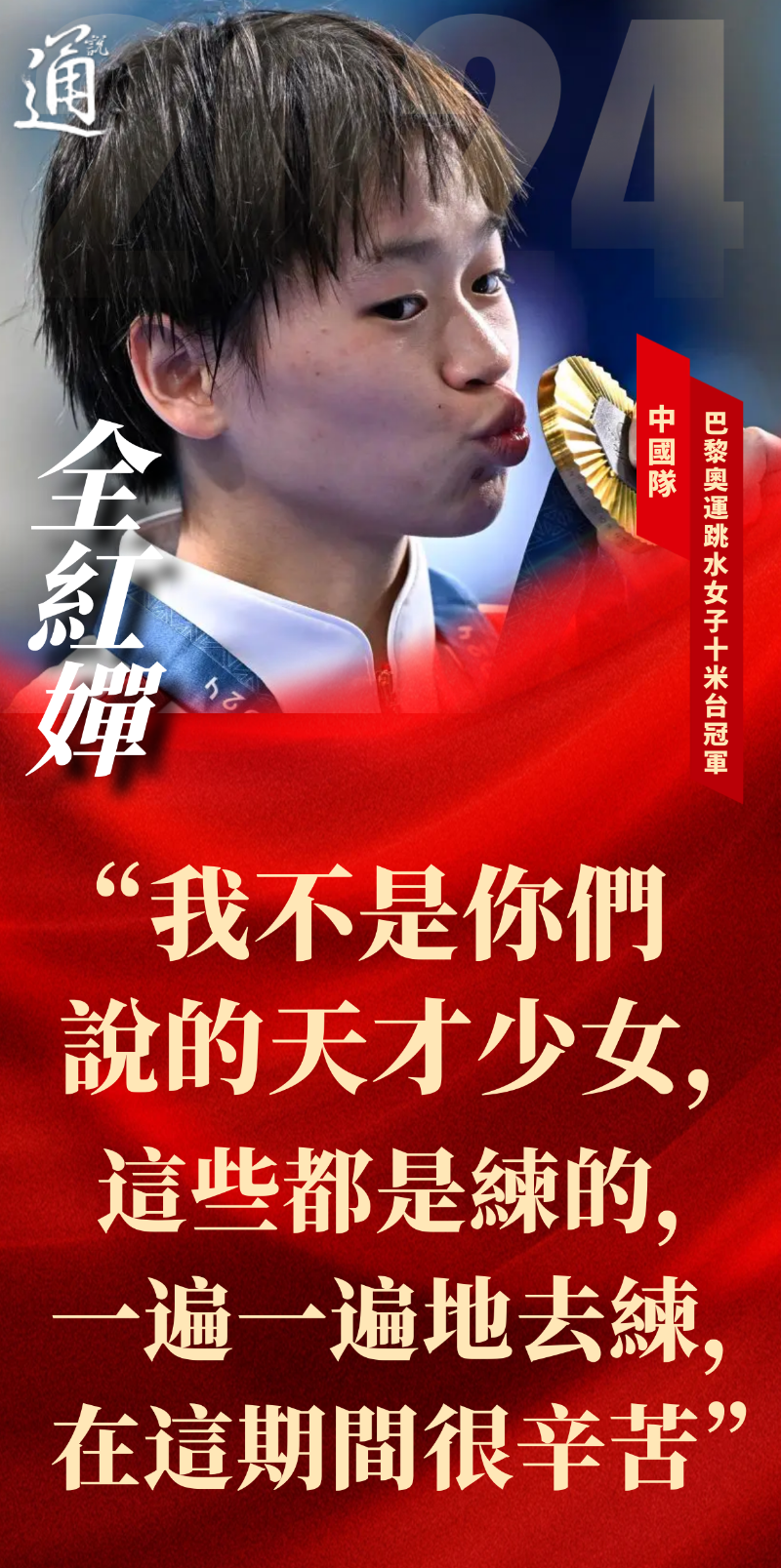 (巴黎奧運)冠軍語萃:天才少女靠練 人生部分告別香港中通社8月7日電 題:冠軍語萃:天才少女靠練 人生部分告別 香港中通社記者 王瑤 當地時間8月6日,巴黎奧運會進入第十一個比賽日的爭奪。當日,中國跳水“夢之隊”再度實現包攬金銀的榮耀;古巴老將奪得古典式摔跤冠軍,成為奧運史上首位在同一項目5屆奪金的傳奇人物。運動員們在賽場上演一幕幕奮勇拼搏的精彩瞬間,賽後亦留下一句句真摯動人的經典話語。