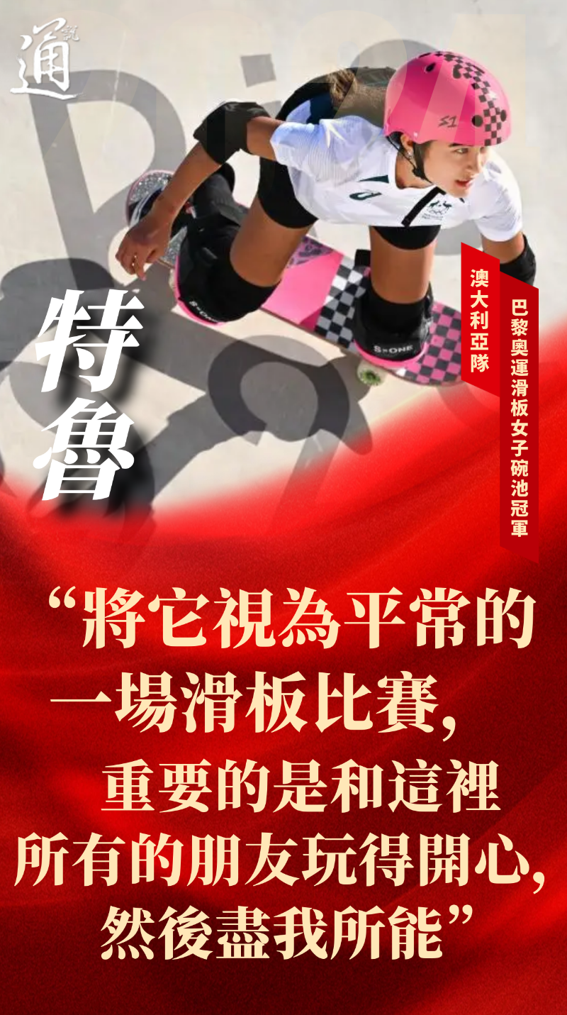 (香港新聞網製圖) 三年前,全紅嬋在東京奧運會橫空出世,以壓倒性優勢奪冠,並創造了奧運會該項目的歷史最高分。然而,出道即巔峰的她,很快面臨生長發育期的挑戰,動作一度不夠穩定,在2022和2023連續兩屆世錦賽中都輸給了陳芋汐,直到2024年多哈世錦賽才首次將世錦賽金牌收入囊中。 回首過去三年,全紅嬋坦言“挺不容易的”。“最困難的是改動作,還有體重方面。因為體重重了,然後動作也要一直去改變。” 東京奧運會一鳴驚人後,全紅嬋就被稱為“天才少女”,但她卻說:“我不是你們說的天才少女,這些都是練的,一遍一遍地去練,在這期間很辛苦。這三年裡,有自己的辛苦、淚水。拿到這枚金牌很不容易。” 讓人不可小覷的年輕小將還有澳大利亞的特魯。在6日收官的滑板女子碗池比賽中,年僅14歲的她摘得金牌。 決賽中,在前兩輪領先的是東京奧運會亞軍、日本選手開心那,直到至關重要的第三局,特魯以完美表現成功反超,最終獲勝。 “太瘋狂,也太令人興奮了。”特魯在賽後表示:“這是我首次參加奧運,當我知道自己是奧運冠軍,確實難以置信。” 她也分享在比賽中保持好心態的秘訣:“將它視為平常的一場滑板比賽,重要是和這裡所有的朋友玩得開心,然後盡我所能,最終目的是要有穩定的成績。” 展望未來,14歲的特魯稱會繼續滑滑板,享受其中的樂趣,並推動自己變得更好。