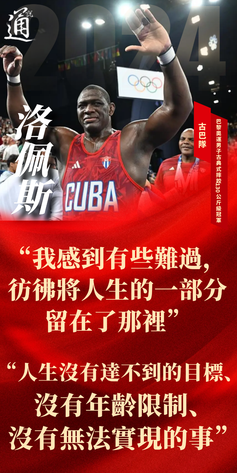 (香港新聞網製圖) 當日的奧運賽場,除了年輕選手紛紛展現青春力量,亦有老將續寫傳奇。 在男子古典式摔跤130公斤級決賽中,古巴選手洛佩斯以6:0擊敗對手,強勢奪金。他亦超越美國泳將菲爾普斯等人,成為奧運史上首位在同一項目5屆奪金的傳奇人物。 此次巴黎賽後,這位已經41歲的老將親吻賽墊,留下他的摔跤鞋,用自己的方式向其傳奇的職業生涯告別。 “我感到有些難過,彷彿將人生的一部分留在了那裡。”洛佩斯說,自己從很小的時候便開始投入摔跤這項運動,也正是摔跤讓自己得以聲名遠播。現時,他在賽墊上留下了一個夢想。
