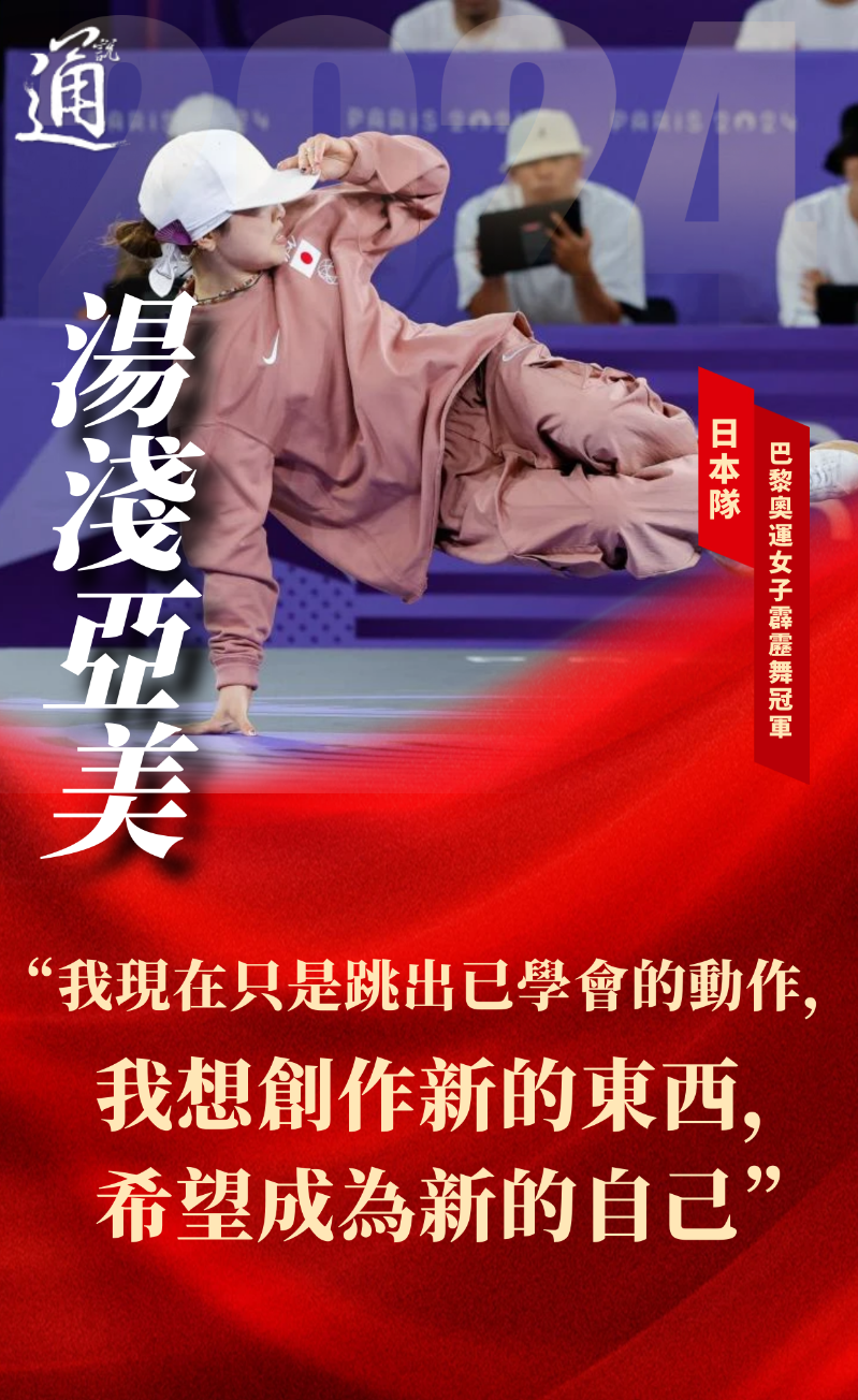 (香港新聞網製圖) 自1988年漢城(首爾)奧運會以來,中國跳水隊從未讓女子三米板的金牌旁落。如今陳藝文亦不負眾望,在巴黎奧運一共奪得兩金。她也希望,自己能夠扛起重任,為中國跳水“夢之隊”贏得更多榮譽。 巴黎奧運會的新增項目霹靂舞,女子組由日本選手湯淺亞美摘下桂冠。在9日的霹靂舞女子項目決賽中,率先登場的立陶宛選手多米妮卡展示了搖滾步,排腿和定點動作亦是輕鬆自如。湯淺亞美則以強而有力的動作應戰,包括使出跳轉等大地板動作。 湯淺亞美在三個回合都獲得較多裁判支持,最終以16:11勝出,成為首位奧運霹靂舞金牌得主。 “我感覺還是像做夢一樣。”奪冠後的湯淺亞美說:“很多人懂得大地板旋轉動作,對我而言,最重要的是微小的細節,當所有東西串連好,就會很出色。”