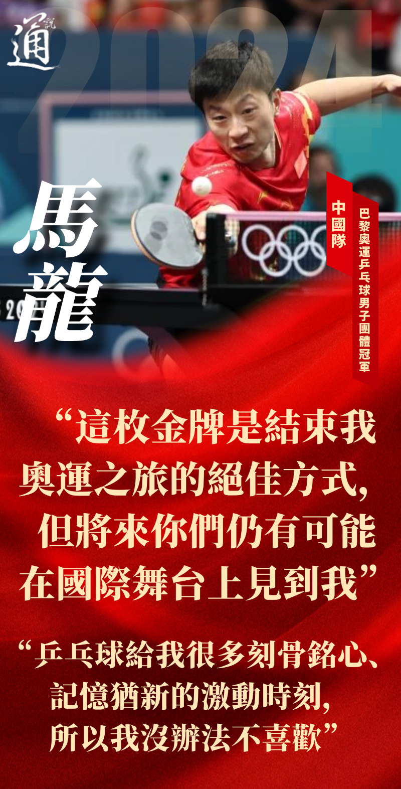 (巴黎奧運)冠軍語萃:完美的最後一舞 繼續創新成就新我香港中通社8月10日電 (香港中通社記者 王瑤)當地時間8月9日,巴黎奧運會進入第十四個比賽日的爭奪,尾聲將近。中國乒乓球隊和跳水隊繼續高歌猛進,距離包攬各自項目金牌均只差最後一步;新增項目霹靂舞在奧運史上的首枚金牌則由日本選手摘下。多年拼搏終有結果,奧運健兒們在賽後流露的真實心聲亦直擊人心。 在9日進行的乒乓球男團決賽中,由馬龍、樊振東和王楚欽組成的中國隊,以大比分3:0戰勝瑞典隊,收穫本屆奧運會乒乓球項目第4金。這也是馬龍奧運生涯的第6金。 如願帶隊贏下男團金牌,馬龍被問的最多的問題就是,這是否他最後一屆奧運會?“巴黎奧運會是自己最後一舞。”馬龍說:“我覺得這個結果確實也是完美的。” 四戰奧運會,馬龍的角色各不相同。本屆奧運會,馬龍是團體三人中唯一參加一項比賽的,從“尖刀”變成了“壓艙石”。 為何如此愛乒乓球?馬龍說:“這項運動陪伴了我30多年,非常有感情,乒乓球讓所有人能知道我,乒乓球也帶給我很多的尊重、榮譽、幫助,當然,乒乓球還給我很多刻骨銘心、記憶猶新的激動時刻,所以我沒辦法不喜歡。”