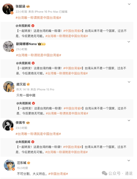 通說:台藝人呼應“台灣必歸”挑動民進黨敏感神經近日,央視新聞官方微博發佈了一條意義非凡的微博:“台灣是中華民族的台灣省,台灣只能是中國的台灣省"。這條微博一出,立刻在網絡上掀起熱議,多位活躍在大陸市場的台灣藝人紛紛轉發,并留言“只有一個中國”。“台灣必歸”等話題也登上大陸社交媒體熱搜。 對於藝人自發行為,台灣當局陸委會8日卻作出“嚴厲譴責”,稱將依照“兩岸條例”進行查處。中國外交部長王毅7日在兩會記者會上強調,台灣地區在聯合國的唯一稱謂就是“中國台灣省”,台灣從來不是一個國家,過去不是,今後更絕無可能。 王毅的堅定表態旋即引發熱議,“中國台灣省”、“台灣必歸”話題成為微博等社交媒體平台熱搜,央視新聞製作的相關海報也被廣泛傳播,轉發者中不乏知名台灣藝人,如陳喬恩、陳妍希、張韶涵、趙又廷等人。