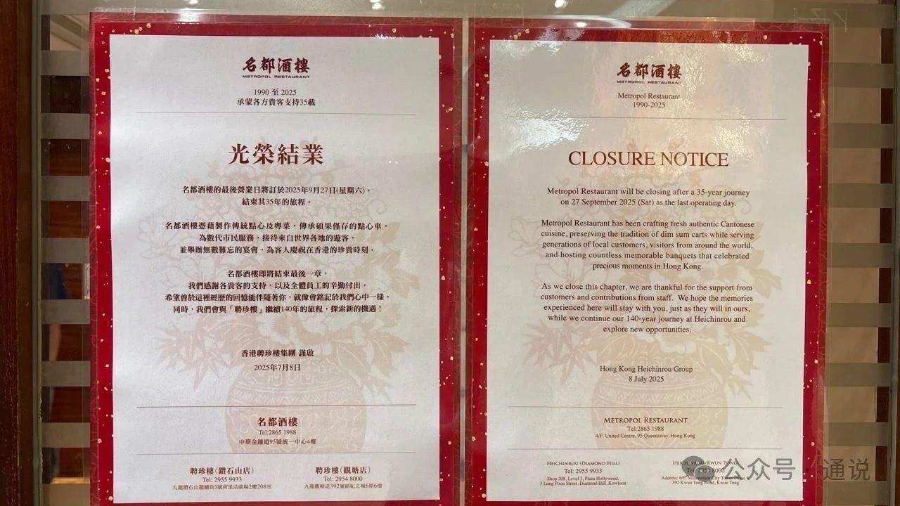 在港開業36年的鴻星中菜(又稱鴻星海鮮酒家)旺角MOKO新世紀廣場店7月2日起結業;開業35載的金鐘名都酒樓也預告將於9月底結業;開業已有逾10年、曾獲《米芝蓮指南》一星級榮譽的連鎖酒樓“新鬥記”也已全線結業……7月剛開始不久,就有多家港人熟悉的酒樓接連關門,部分酒樓發出通知時已即時結業,令人愕然,也讓不少熟客惋惜沒來得及“最後品味”。